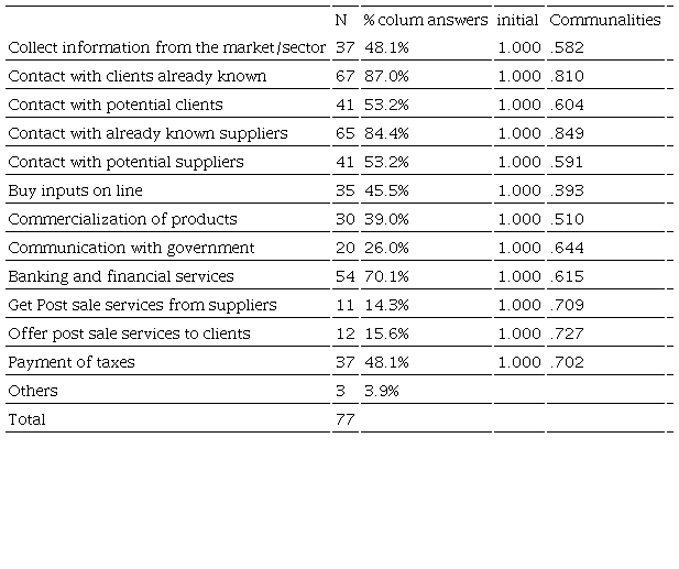 Table 1 shows communalities from each ICT use indicator obtained through Component Principal Analysis. We observe that one indicator, buying inputs online, is not relevant for explaining the variance (since communality is lower than 0.4).