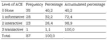 On the other side, ACE is an ordinal variable which is based on Jones et al (2016) and Molla (2005). It has four possible values (Table 3): 0, if the firm does not have a web site; 1 if the firm has a static e-commerce (publishing basic information of the firm on the web site without any interaction); 2 if the firm has an interactive e-commerce, meaning that firm accepts queries, e-mail and form entry from users, and 3 if the firm achieves a transactive ecommerce, that is selling and purchasing products online.