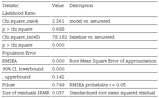 Moreover, to offer a more sensible approach than the test of exact fit, we use the Root Mean Square Error of Approximation (RMSEA). If RMSEA is lower than 0.05 and does not exceed the lower bound of the 90 percent confidence interval, the model fit is good (Steiger, 1990). Since RMSEA is zero, we can determine the model fits well.