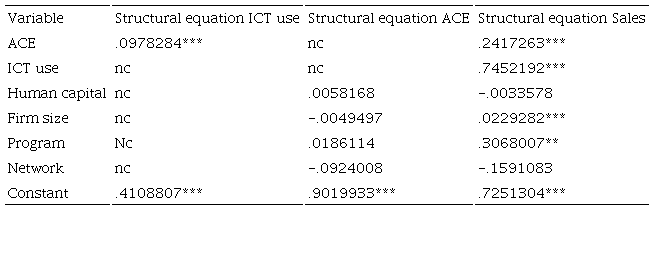Besides, ICT use directly impacts on SME sales (hypothesis 1). ACE significantly and positively explains sales (β=0.7452). Hence, firms with a higher level of electronic commerce have more chances to commercialize their products and contact potential clients, which finally lead to a better performance. Since ICT use positively explains sales, ICT use mediates the relationship between electronic commerce level and performance (hypothesis 2).