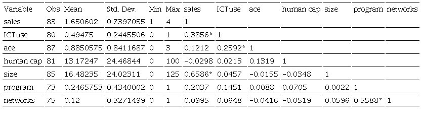 There are different measures of performance: sales per worker, aggregate value per worker, exports, innovation, and so on. Choosing one indicator or another depends on data availability or previous findings. For instance, Criscuolo and Waldron (2003) find electronic commerce have a larger impact on the aggregate value than on sales. In this paper, we use the variable sales, which is an ordinal variable with 4 categories based on the amount of sales per year: 1 (less than 115 thousand dollars), 2 (between 115 and 656 thousand dollars), 3 (between 656 and 5235 thousand dollars), and 4 (more than 5235 thousand dollars). This rank is based on the SME classification for industrial firms published by the SME Secretary 21/2010 resolution in Argentina. By asking firms to choose their corresponding category of sales, we avoid missing data (since firms are reluctant to provide information about specific amount of sales, especially in developing countries).