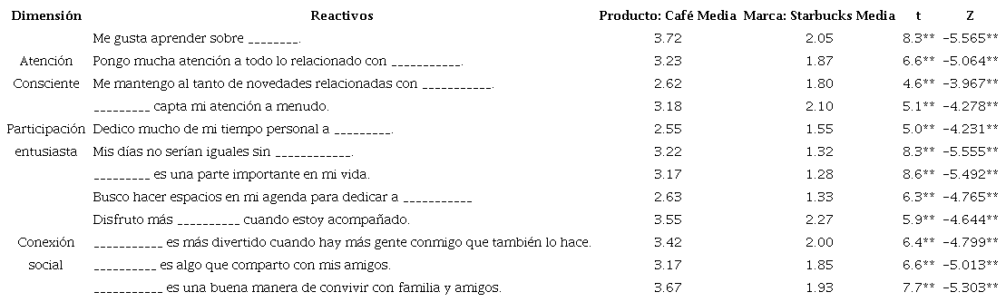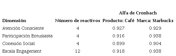 Como se puede ver en la Tabla 1, los reactivos del instrumento están diseñados de tal forma que permiten adaptarse a diferentes objetos de engagement, en este caso la categoría del producto: café en taza, y una marca dentro de la categoría: Starbucks. Esta marca se seleccionó por ser una con un alto nivel de reconocimiento para los sujetos que participaron en las pruebas. Dada la variedad de productos ofrecidos por esta marca y para poder hacer una comparación más clara con la categoría de producto, se hizo la aclaración, al momento de aplicar el instrumento, de considerar solamente el consumo de un café tipo americano, para evitar sesgos.