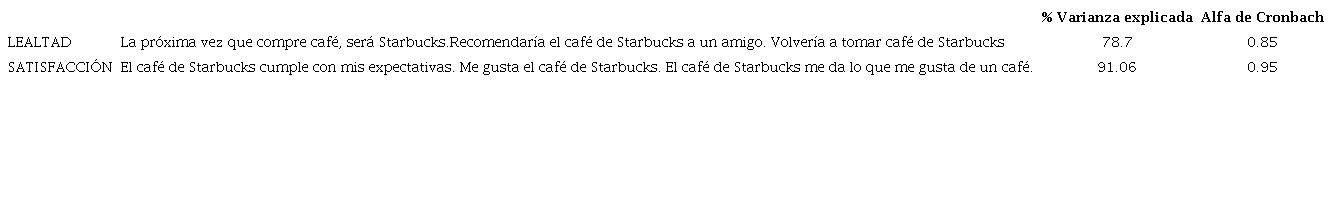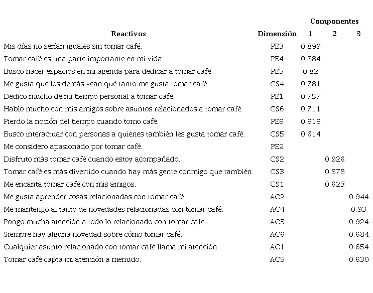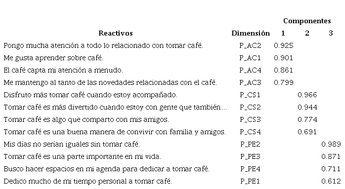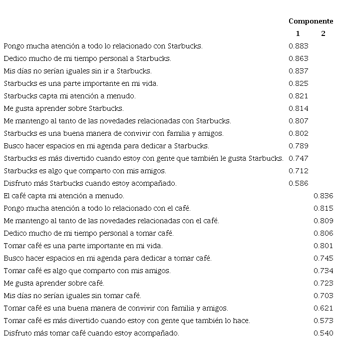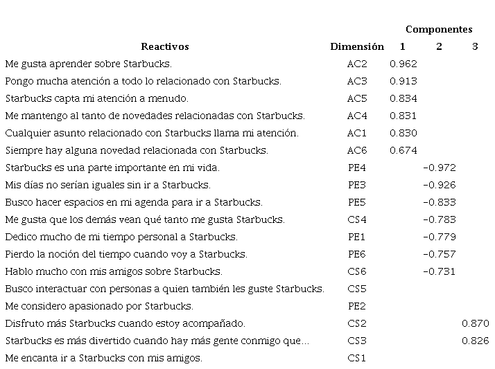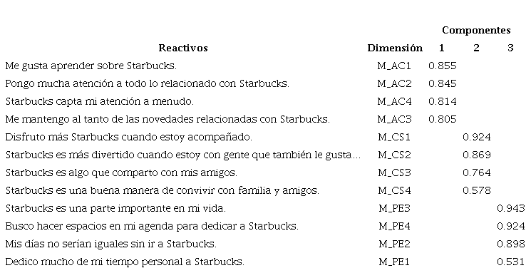 La Tabla 2 muestra los resultados de la prueba de validez por convergencia y discriminación mediante un análisis factorial confirmatorio (con rotación) para el nivel de producto (café en taza). De forma similar, la Tabla 3 muestra estos resultados al nivel de marca (Starbucks). Aunque, como se irá viendo, en este trabajo se utilizan métodos estadísticos de tipo paramétrico (ej. análisis factorial, regresión), y las variables utilizadas son de tipo ordinal/discreto, existen evidencias de que los métodos paramétricos lineales consistentemente generan resultados confiables a pesar de que existan ciertas violaciones a los supuestos de lo paramétrico como pueden ser la normalidad de los datos y el nivel de medición (Norman, 2010). Estos análisis tienden a confirmar la tridimensionalidad propuesta por el instrumento original, donde los reactivos y sus cargas factoriales se agrupan de manera congruente con la dimensión a la que originalmente pertenecen.