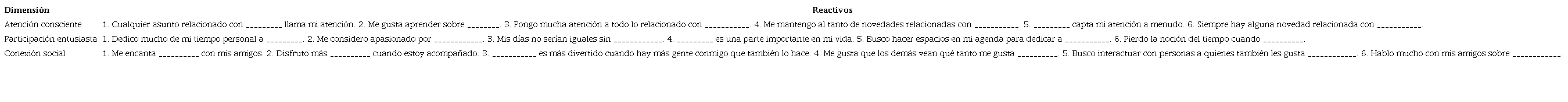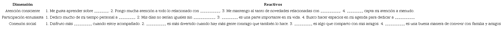 Se utilizó como base el conjunto inicial de 40 reactivos utilizados por Vivek et al. (2014). Después del proceso de depuración, cada una de las 3 dimensiones quedaron con 6 reactivos para una escala final de 18 reactivos en total. Este proceso de depuración de reactivos se llevó a cabo considerando aquellas afirmaciones cuyo sentido, una vez traducidas al español, generan menos ambigüedades y un mejor entendimiento. Se realizó una adaptación al español enriquecida con aportaciones de tres expertos, cuyo perfil ha sido previamente descrito, para elegir los términos más adecuados. Se realizaron las pruebas pertinentes a los dieciocho reactivos bajo la premisa de que la escala final constaría de un número menor de reactivos debido al proceso normal de depuración de una escala. Estos 18 reactivos se muestran en la Tabla 1.