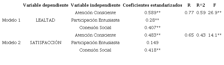 Los reactivos para lealtad de marca y para satisfacción fueron sometidos en sendos análisis factoriales para corroborar su validez de convergencia. Posteriormente, se utilizaron los puntajes factoriales de cada uno como variables (latentes) dependientes en las pruebas de validez predictiva. De tal forma, con estas dos variables latentes, se elaboraron dos modelos de regresión donde las variables independientes fueron los puntajes factoriales de los componentes en los que convergieron los reactivos de engagement. A diferencia de los análisis factoriales anteriores, estos puntajes factoriales se obtuvieron con rotación varimax. Esta, es un tipo de rotación de tipo ortogonal para evitar problemas de multicolinealidad de las variables independientes en los modelos de causalidad (como los de regresión). Los resultados de los modelos de regresión se muestran en la Tabla 9.