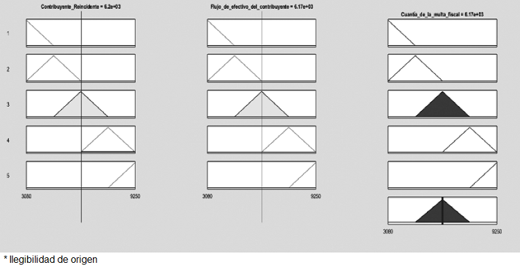 Por lo tanto, hay que dar la instrucción al programa para que muestre las reglas, lo cual crea una nueva ventana en la que la gráfica de la variable "Contribuyente reincidente", se puede observar el valor de mayor pertenencia le corresponde al polígono ubicado en la regla tres, ubicado en la columna de la extrema izquierda. Las salidas se muestran en la columna de la extrema derecha, donde se aprecian claramente las reglas cumplidas en la parte inferior de esta columna, el polígono resultante en color más obscuro de la inferencia que representa el valor de la cuantía de la multa fiscal que ha de cobrarse a los contribuyentes infractores. En la figura 10 puede apreciarse el resultado de la defuzzificación tanto de forma gráfica con una línea, que en realidad es un cursor que puede tomar cualquier valor dentro de la variable en cuestión, como numérica en la parte superior de la columna. Particularmente, en esta graduación se considera el agravante de "casi reincidente". Por lo que, el monto de la multa determinado ascendió a 6 190 pesos.