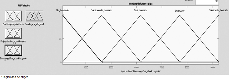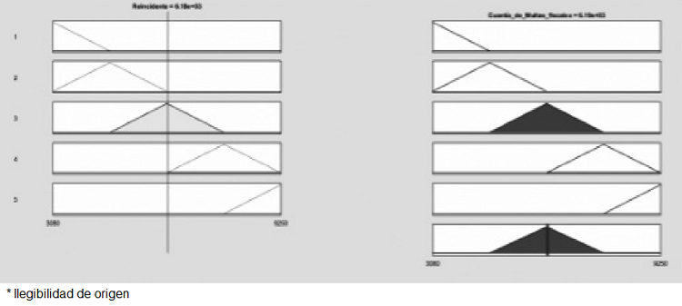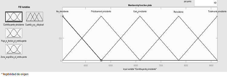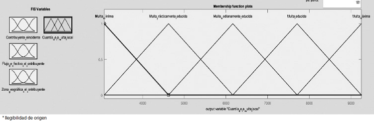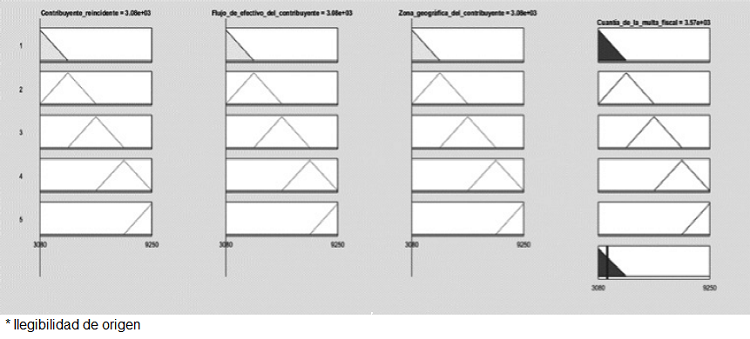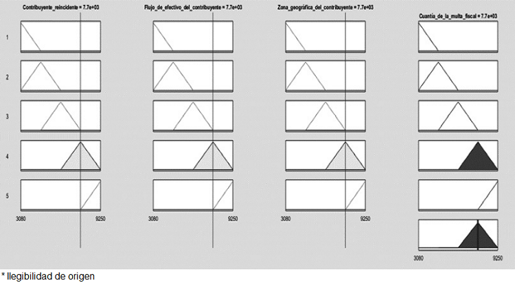 En la fase dos se dividieron, tanto los espacios de entrada como los de salida en cinco clústeres triangulares. El número obedece a las etiquetas lingüísticas para las variables definidas en la fase 1. Por lo que, la partición de los espacios de entrada se realizó de la siguiente manera: Para la variable "Contribuyente reincidente" (Agravante), las etiquetas lingüísticas son los efectos del comportamiento fiscal, de menor a mayor grado, en cuanto a ser: No reincidente, Prácticamente reincidente, Casi reincidente, Reincidente y Totalmente reincidente. A partir del criterio sugerido por los expertos de tomar en cuenta el número de ocasiones en las que ha sido infraccionado el contribuyente, si es de forma continuada o no, etcétera. Para la variable "Flujo de efectivo del contribuyente" (Atenuante) la membresía que se asignó fue: No solvente, Prácticamente solvente, Casi solvente, Solvente y Totalmente solvente. Al igual que la anterior, los niveles establecidos fueron obtenidos por los criterios de los expertos y la literatura. A su vez, la variable "Zona geográfica del contribuyente" (Atenuante) también se graduó utilizando las etiquetas de No urbanizado, Prácticamente urbanizado, Casi Urbanizado, Urbanizado y Totalmente urbanizado, tomando en cuenta los criterios anteriormente expuestos. Por último, la variable de salida "Cuantía de las Multas Fiscales", al igual que las demás variables, las valoraciones lingüísticas se determinaron asignando cinco niveles de membresía. Específicamente, Multa mínima, Prácticamente reducida, Medianamente reducida, Reducida y Totalmente reducida. De modo que, el rango de las variables fue de 3 080 a 9 250, que es el monto económico, tomado del intervalo de la multa relacionada a no solicitar inscripción cuando se está obligado a ello o hacerlo extemporáneamente [...].1