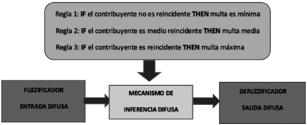 b) En segundo lugar, se tiene el dispositivo de inferencia junto con la base de información a priori; a su vez se procesarán a fin de que el sistema realice la toma de decisiones. Específicamente, el sistema de información difuso se basa principalmente en determinar el grado de pertenencia de los datos de entrada en los conjuntos difusos (contribuyente reincidente, flujo de efectivo del contribuyente, zona geográfica del contribuyente) de los espacios correspondientes, siempre que estas se den para tomar una decisión en el espacio de salida, que en este caso será la "Cuantía de las multas fiscales".