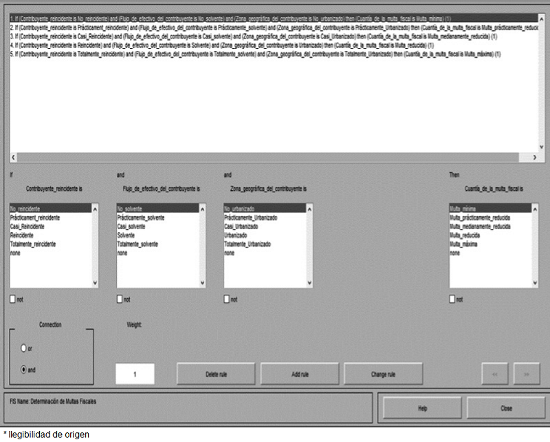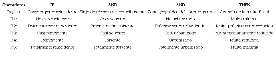 Por otra parte, el modelo de inferencia difuso muestra diversos criterios basados en opiniones subjetivas debido a que la información con la que se cuenta es incierta, pues no existen datos precisos para determinar una proporción de la multa. Un marco legal distinto es indispensable para que los expertos, específicamente, las autoridades encargadas de determinar las sanciones, tengan más información para fundamentar y motivar la asignación de las valoraciones. La implementación del sistema consistió en seleccionar variables de entrada y salida. De igual modo, se utilizaron reglas, dado que el sistema de información difuso se basa principalmente en determinar distintos niveles de membresía de los datos de entrada en los conjuntos difusos de los espacios correspondientes, con el objetivo siempre que estas se den para tomar una decisión en el espacio de salida, como lo es la obtención de la "Cuantía de las multas fiscales".