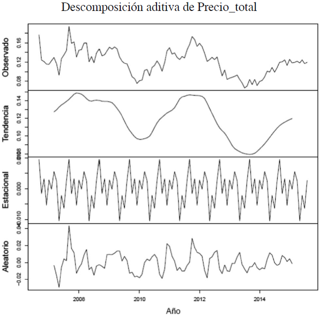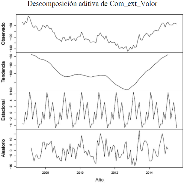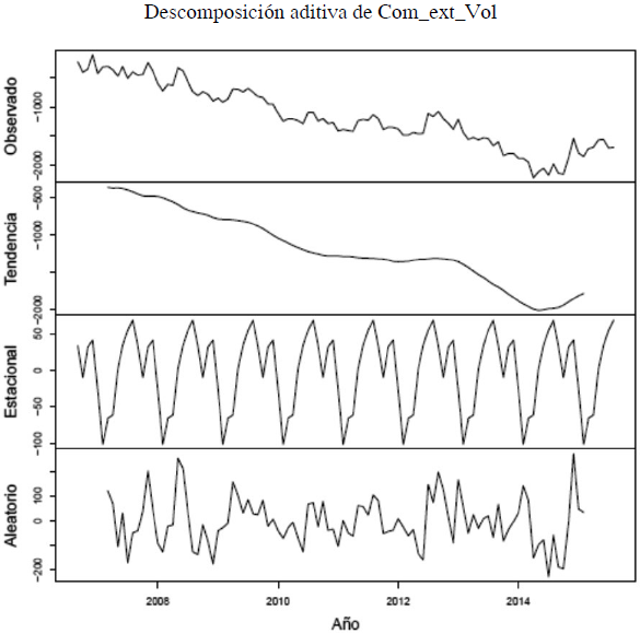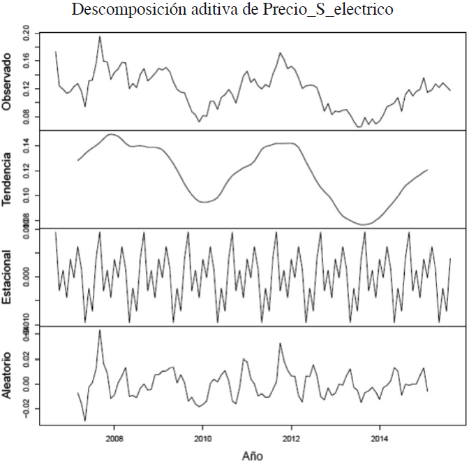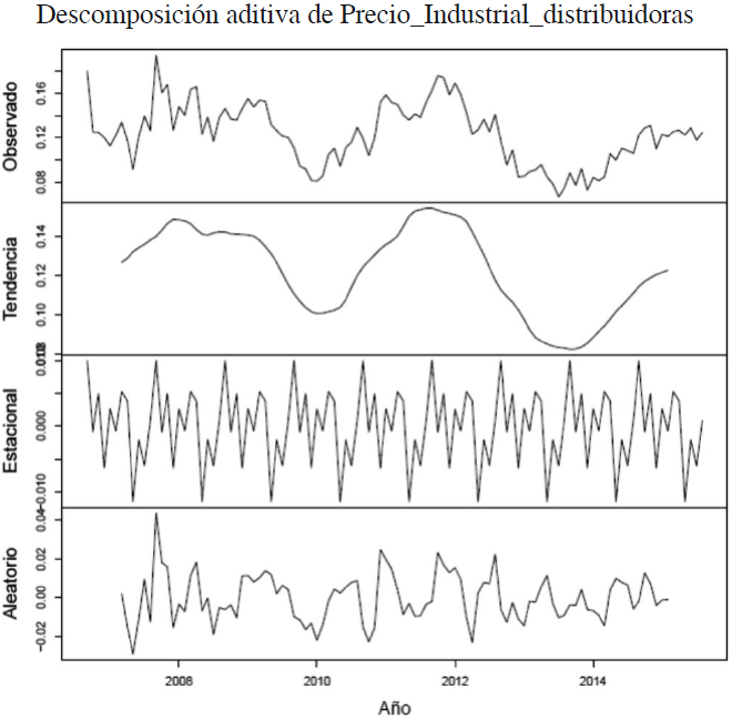 Para ver esto con más claridad consideremos, primero, la ecuación (1). De acuerdo con esta ecuación, los precios del sector eléctrico y el volumen de importaciones tardan entre 5 y 29 meses en que los shocks temporales sean absorbidos por la tendencia respectivamente, mientras que, en el caso de las series de comercio exterior en valores, los shocks son permanentes, porque hacen cambiar la tendencia. En las series restantes, el regreso a su media móvil (volumen de comercio exterior) o a su tendencia después de dos rezagos (precios-Industrial-distribuidoras) es indeterminado porque, al no ser procesos AR (1), éste no puede ser calculado mediante el VMS. De todos modos, la conclusión no cambia, ya que la mayoría de las series sigue una trayectoria marcada por su tendencia que, como se aprecia, en las figuras de la descomposición aditiva, difieren en comportamiento según se trate de precios cantidades o valores (ver las figuras 1)
