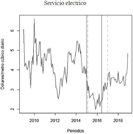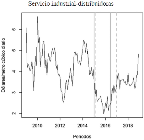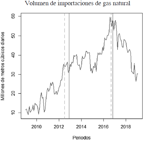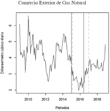 La intuición económica de los resultados de la Tabla 3 es que los precios, valores y cantidades de gas natural tienden a ser inflexibles a la baja o al alza después de que sus series experimentan quiebres en tendencia e intercepto. En las figuras 2 podemos observar que, mientras una serie tiende persistentemente a la baja en octubre de 2016 (volumen de importaciones), las restantes tienden al alza en los distintos meses de 2016 y 2017. Esos quiebres en dirección vienen asociados con cambios en el nivel o en la media de la tendencia (debido a los cambios en el intercepto)