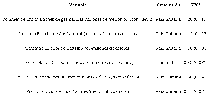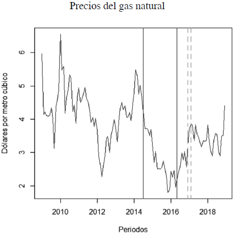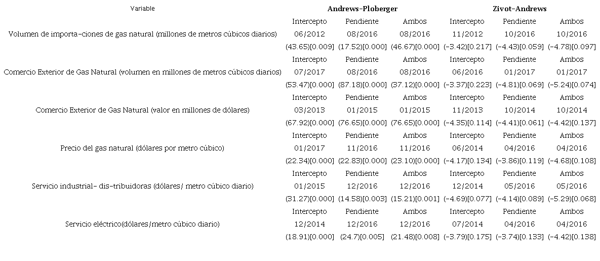 En resumen, usamos los dos procedimientos para combinar técnicas convencionales de contraste de estacionariedad con métodos robustos de quiebres estructurales para caracterizar de una forma más completa la dinámica de las series de precios y cantidades del gas natural en México. Ambos procedimientos ofrecen información complementaria y confirmatoria de la posible existencia de un probable y desconocido cambio estructural producido por la reforma energética. El estudio de los niveles y primeras diferencias de las series es, pues, un recurso necesario para usar adecuadamente los dos tipos de procedimientos. En lo que toca al estudio de los dos métodos aquí empleados para calcular los cambios estructurales, Maddala y Kim (1998) sostienen que los estimadores de sus parámetros tienen propiedades asintóticas deseables que los hacen eficientes e insesgados con relación al tamaño de la muestra.