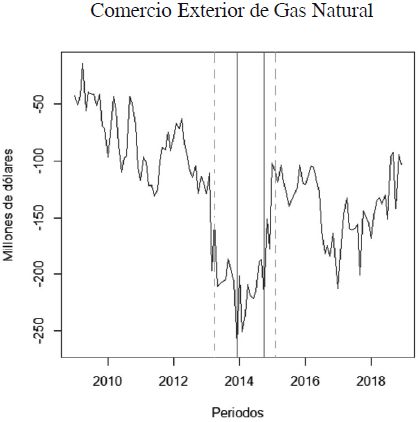 Los datos utilizados provienen del Sistema de Información Energética de la Secretaría de Energía de México con información de PEMEX y comprenden las variables más importantes del comercio exterior y las ventas nacionales de gas natural entre enero del 2009 y diciembre del 2018. Las series mensuales sobre valores y cantidades de las ventas nacionales incluyen las transacciones totales y su división por sectores (industrial-distribuidoras y eléctrico), mientras que las del comercio exterior aparecen desplegadas en volúmenes y valores del saldo neto de la balanza comercial. Inicialmente las series datan de 1993 pero, por omisiones en el registro de varias variables durante largos periodos de tiempo, no es posible disponer de información regular y confiable sino hasta el mes de septiembre de 2005. En nuestro caso tomamos como punto de partida el mes de enero de 2009 no solo porque su elección permite tener una muestra balanceada hacia atrás (2009-2013) y hacia adelante (2014-2018) del periodo de observación de la reforma energética del 2013 sino, principalmente, porque se trata del año en que la producción nacional de gas alcanza su pico más alto con 7 mil millones de pies cúbicos. Es decir, tomamos un inicio de periodo excepcional para observar el movimiento de las variables asociado con la caída sistemática de la producción local de gas. El tamaño de la muestra resultante es, pues, de 120 observaciones para cada una de las series.