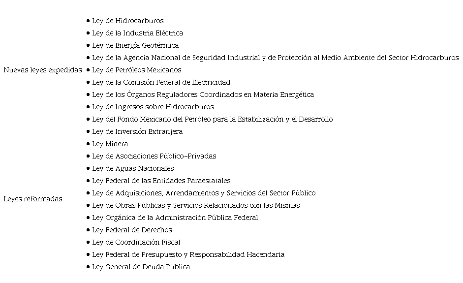 La tabla 1 presenta un resumen de la legislación secundaria publicada en el Diario Oficial de la Federación el 11 de agosto de 2014, en el que se expidieron 9 nuevas leyes y se reformaron 12 leyes existentes16,