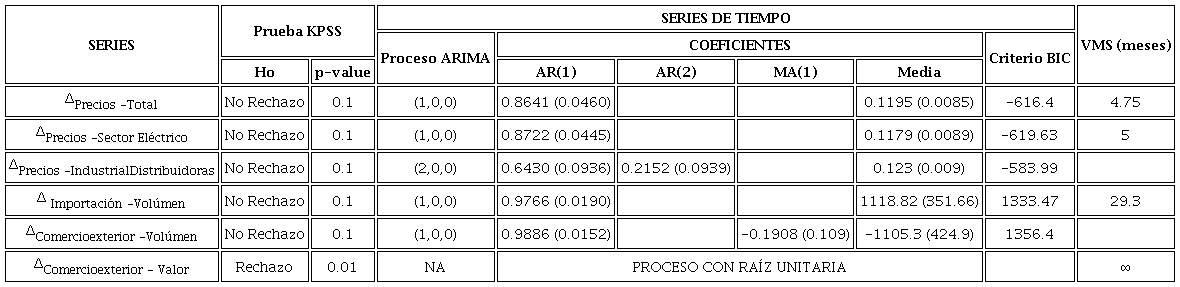 Los resultados del cuadro 1 muestran que, al considerar sus primeras diferencias, cinco de las seis series bajo estudio tienen tendencia estacionaria y solo una, la de comercio exterior medida en valores, sigue un proceso de raíz unitaria (ver columna de rechazo y aceptación de KPSS). Contrario a las series con raíces unitarias, las funciones de impulso-respuesta empleadas en las pruebas de las series estacionarias tienden a desvanecerse o, lo que es lo mismo, los shocks sobre las series de tiempo son absorbidos por la media de la tendencia. Concretamente, en algunos procesos autoregresivos asociados a cada una de ellas se puede observar que la vida media de una unidad de shock (VMS) es muy corta.