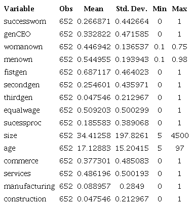 As we can see in table 2, on average only 26 % of the family businesses analyzed consider a woman for the succession process. The majority of the CEOs in the business analyzed are men, the percentage of men ownership is greater than women on average. Most of the business analyzed are first generation, which shows the problems that the family businesses in Mexico. The average age of family businesses is 17 and the average number of employees is 34. It's important to note that on average only 18 % of business have defined a succession process. Finally, dominant sector are services and commerce.