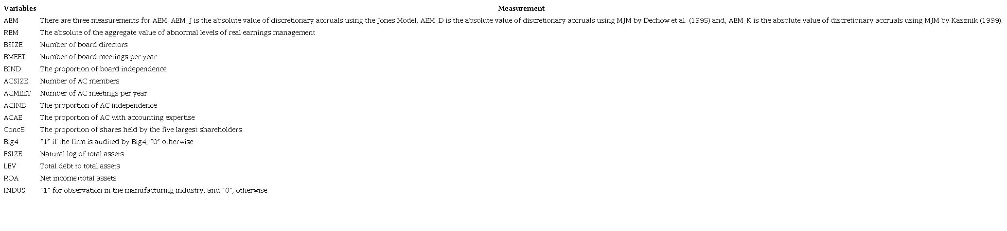 This study follows previous work in examining whether there is a relationship between AEM and REM. The previous studies used two empirical models, AEM and REM (Chen et al., 2012; Laksmana & Yang, 2014; Lemma et al, 2018). This study follows previous work first by including REM as an independent variable in the AEM models; and second by including AEM as an independent variable in the REM model. Furthermore, to minimize the probability of endogeneity and error in determining the models, this study included two groups of control variables related to CG mechanisms (Prencipe & Bar-Yosef, 2011). First are those related to the BOD, namely, board size (BSIZE), meetings (BMEET) and independence (BCIND); and to the AC, namely, AC size (ACSIZE), meetings (ACMEET), independence (ACIND) and accounting expertise (ACAE). Additional CG mechanisms namely, ownership concentration (Conc5) and Big4 audit firms (Big4) are also included. Secondly are the control variables related to firm-specific characteristics, namely, firm size (FSIZE), return on assets (ROA), leverage (LEV) and industry dummy (INDUS). These factors may influence managers' attitude towards engaging in earnings manipulations; they might also determine the use of AEM and REM as complementary or substitute tools. The definitions of the control variables are provided in Table 1. Thus, the empirical models used are: