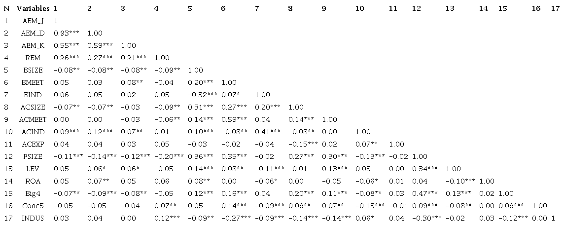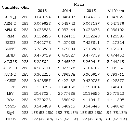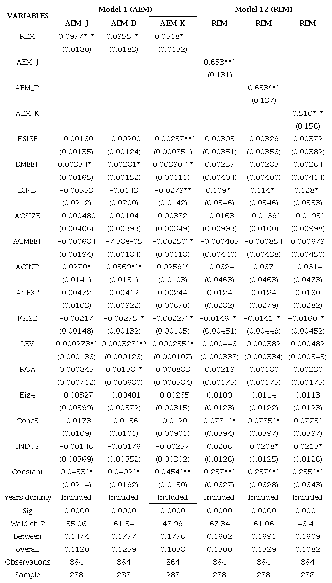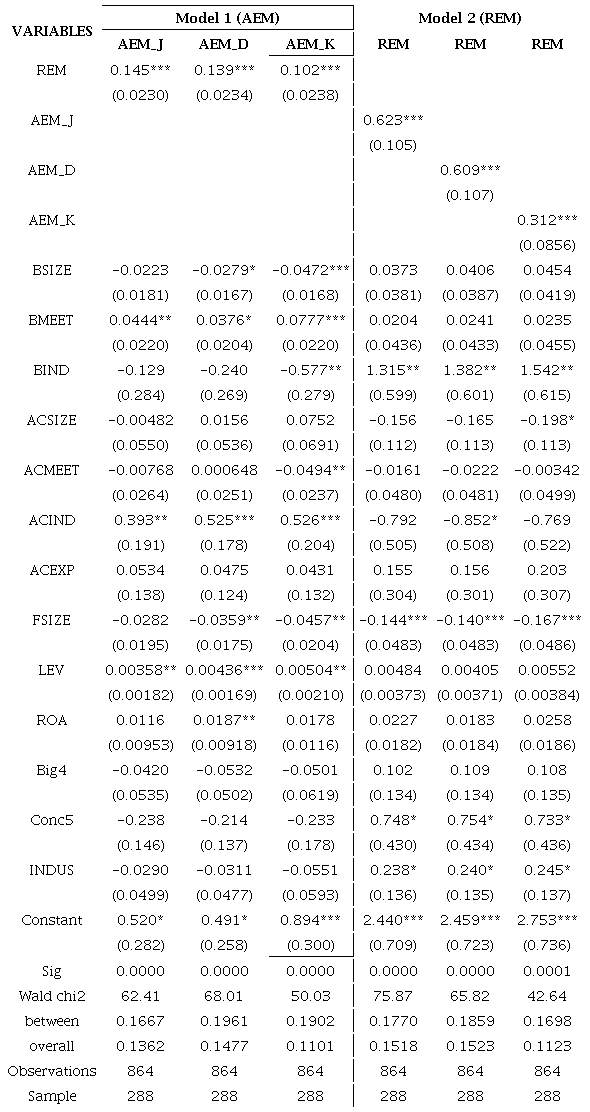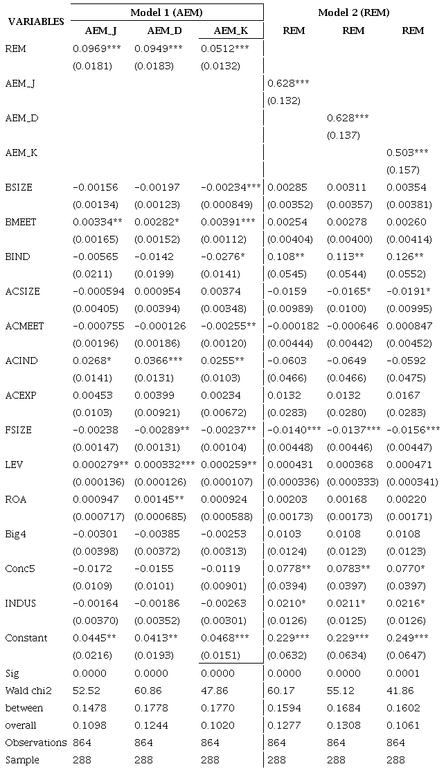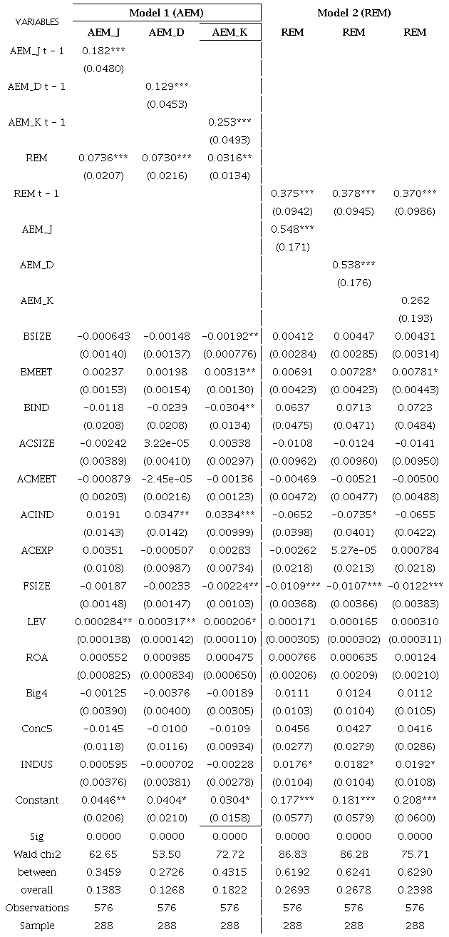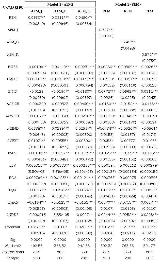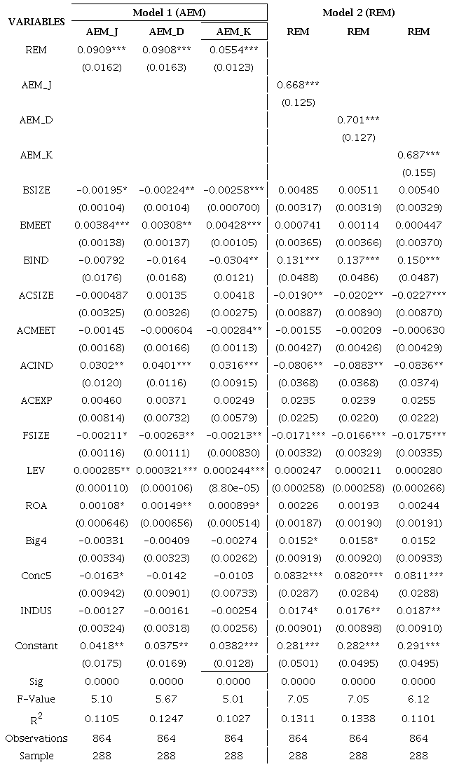 Table 2 shows the descriptive statistics of the variables. For AEM, the average AEM-J is 4.99, 4.84 and 4.45% for 2013, 2014 and 2015, respectively. The average AEM-D is 4.96, 4.87 and 4.52% and the average AEM-K is 3.69, 3.74 and 3.40%. It seems that there is no significant difference in the average AEM during these years. Taking all years together, the overall average value of AEM-J, AEM-D and AEM-K is 4.76, 4.79 and 3.61%, respectively. For REM, the average value is 13.24, 12.41 and 13.22% for 2013, 2014 and 2015, respectively. It seems that there is no significant difference in the average of REM over the years. Taking all the years together, the overall average value of REM is 12.96%.