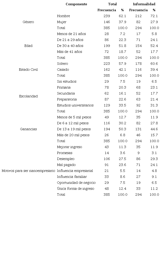 La Tabla 1 muestra los estadísticos descriptivos de frecuencia, donde se aprecia que la mayoría de las personas son hombres (62.1%), y que la mayoría de los nano emprendedores encuestados reportó tener entre 30 a 40 años de edad. La mayor parte de ellos argumentó ser soltero (57.9%), mientras que el resto se encontraba casado. Asimismo, muchos de estos nano emprendedores señalaron que sus ganancias promedio mensual oscilan entre 13 a 19 mil pesos, obteniendo un promedio de la muestra de 15,376.6 pesos. De igual manera, se observan los porcentajes de los participantes según los motivos que los orillaron para ser un nanoempresarios. De manera general, se aprecia que el motivo más frecuente para emprender una nanoempresa fue "el desempleo", "empleos mal pagados", "única forma de ingreso" y "mejorar el ingreso familiar", mientras que el de menor importancia fue "las promesas del gobierno".