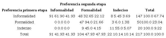 En lo que respecta a la categoría de los participantes indecisos, se nota que ninguno (0.0%) en la primera etapa prefiere pasar a la informalidad en la segunda (celda i = 3, j =1), mientras que 45% (celda i = 3, j = 2) cambió hacia la formalidad. En relación con la submuestra de 217 participantes, estos porcentajes fueron de 0.0% y 4.15%, respectivamente.