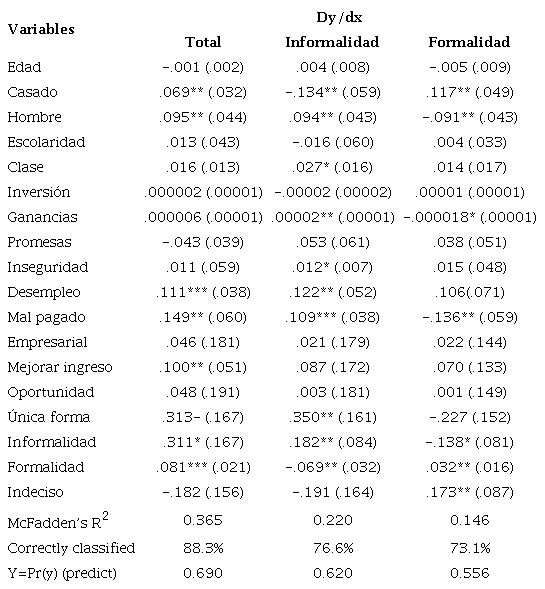 Un dato adicional que arrojan las estimaciones de las variables Informalidad, Formalidad e Indeciso es la seguridad de los participantes en cada categoría; por ejemplo, se aprecia que los nanoemprendedores que muestran "mayor seguridad en su decisión" son los que prefieren seguir en la informalidad (0.410), seguidos de los que prefieren la formalidad (0.554). Finalmente, el impacto de la variable Indeciso sólo es significativo para el modelo de formalidad, ya que los participantes que no tenían definida (o no quisieron contestar) su preferencia en la primera etapa mostraba una incidencia positiva y significativa sobre la probabilidad (0.096) de preferir por esta categoría en la segunda etapa.