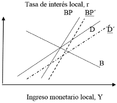 La figura 1 muestra que ante una devaluación de la moneda local la balanza de pagos y la curva LM se trasladan a la derecha (BP' y D' respectivamente) mejorando la balanza comercial. En la figura 1 no se muestra de manera explícita el tipo de cambio, su efecto se ejerce a través del precio relativo de los bienes (local y extranjero) en las curvas BP y D. A cualquier nivel de ingreso, se puede aplicar una política monetaria de estabilización. En este caso, la disminución de la tasa de interés local propicia el equilibrio de la BP y del mercado de bienes. Sin embargo, si prevalece un régimen de tipo de cambio fijo la política monetaria por sí misma no puede lograr el equilibrio y el pleno empleo, se requiere utilizar la política fiscal7. Como lo vislumbró Mundell (1963), el desafío es adoptar reglas para utilizar los instrumentos de política que aseguren los equilibrios interno y externo simultáneamente.