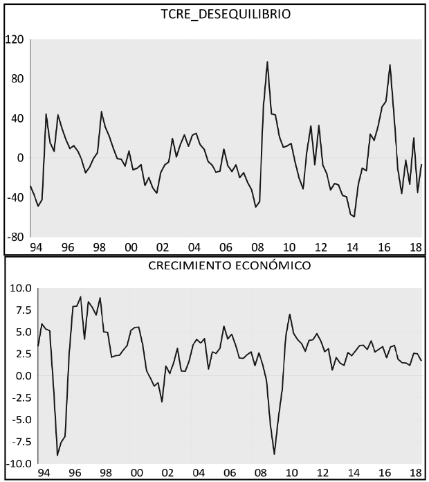 Al comparar en el período de análisis el TCRE con el crecimiento económico, se observa una fuerte desviación en la que el tipo de cambio se encuentra por debajo del TCRE estimado (depreciación) sin impulsar el crecimiento a partir del 2014 (véase figura 2).