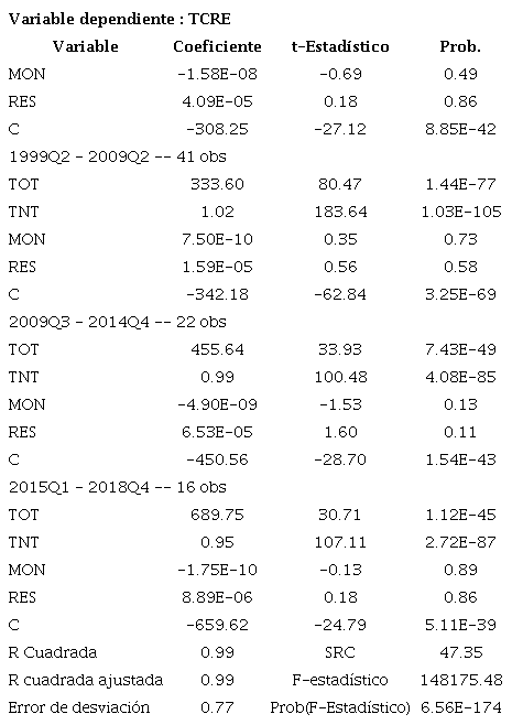 La serie en el período de análisis presenta varios cambios estructurales que se comprueban con la prueba secuencial Bai y Perron (2003), la cual determina las rupturas que deben incorporarse en la muestra (véase tabla 1). Con el estadístico F y un nivel de significancia del 5% se determina como cuatro el número de las rupturas óptimas. De esta forma, procedemos a estimar el TCRE a través de una regresión de mínimos cuadrados con intercepto e incluyendo 4 rupturas (1995Q4, 1999Q2, 2009Q3, 2015Q1) segmentando la serie completa en cinco partes.