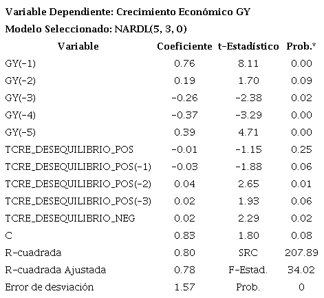 El modelo seleccionado (5, 3, 0) a través del criterio de información Hanna-Quinn (HG) incluye cinco rezagos de la variable dependiente correspondiente a la tasa de crecimiento (GY), tres rezagos TCRE POS(-3) y un rezago TCRE NEG(-1).