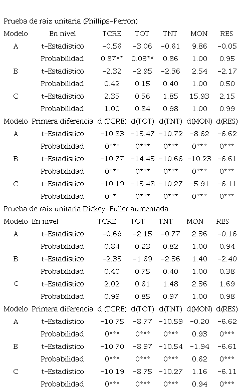 Donde RES son las reservas internacionales denominadas en moneda extranjera, MON es la oferta monetaria, TNT es la razón de precios de bienes comerciables a no comerciables, TOT son los términos de intercambio y e representa el término de error. Incluimos las variables que afectan al TCRE en el corto y largo plazo. Como vemos, el modelo incluye variables que representan la cuenta corriente (balanza comercial y términos de intercambio) y la cuenta de capitales (reservas en moneda extranjera y oferta monetaria).