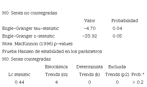 A través del análisis de integración de las variables en niveles y en primera diferencia se aplican las pruebas Dickey-Fuller aumentada (DFA) y Phillips-Perron (PP). Se comprueba que las variables son estacionarias en primera diferencia y seleccionamos el número de rezagos óptimo con el criterio Akaike (ver Tabla A1 en el anexo). También se encuentra que las variables presentan una relación de largo plazo con la prueba de Engel-Granger y se comprueba la estabilidad en los parámetros con la prueba de Hansen (1992) que acepta la hipótesis nula: las series están cointegradas (ver Tabla A2 en el anexo).