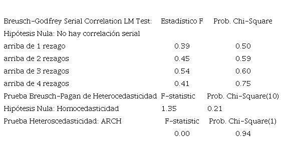 Aplicamos las pruebas LM de autocorrelación serial Breusch-Godfrey para cuatro rezagos sin rechazar la hipótesis nula de correlación serial. La prueba de Breusch-Pagan-Godfrey rechaza la presencia de heterocedasticidad (véase Tabla A3 en el anexo).