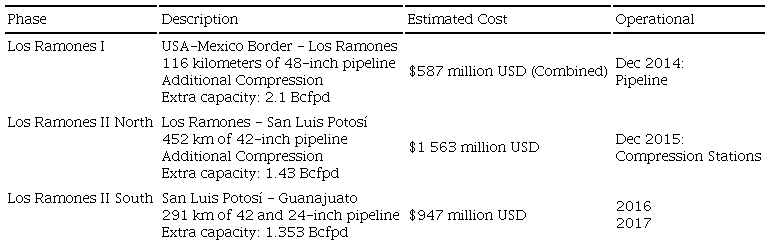PEMEX is the 15th world’s producer of natural gas. However, one of its main challenges is distribution at a national level. To cope with this problem, the investment project was designed in two phases. In a broad perspective, “Los Ramones I” focuses on transportation of the natural gas imports from United States to the northern part of the country, while “Los Ramones II” focuses on distribution of both national and foreign production to the Midwest. For the construction of “Los Ramones I”, PGPB signed a long-term transport service contract with the company Gasoductos del Noreste to build a 48-inch diameter and 116.4-kilometer length pipeline running from Agua Dulce, Texas to Los Ramones, Nuevo León. The operation of “Los Ramones I” started in December 2014 with the objective of increasing the transport capacity by 1.0 billion cubic feet per day (Bcfpd). An additional construction of two compression stations was made in order to raise the capacity up to 2.1 Bcfpd, which started operations on December 2015. PEMEX reported that total investment for the construction of the pipeline and the two compression stations was approximately USD $587 million [PEMEX (2015; 2016)].