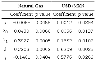 According to the information published by PEMEX, the expansion factor used in the valuation is 2.33 and the investment cost $2.51 billion USD. The valuation period for this analysis is from 2015 to 2020, being January 2015 the investment decision period. The individual TGARCH models estimated to obtain the long-term volatility of both underlying assets are TGARCH (1,1). Results are reported in Table 2, where it can be noted that all the coefficients are statistically significant at a 5% level.