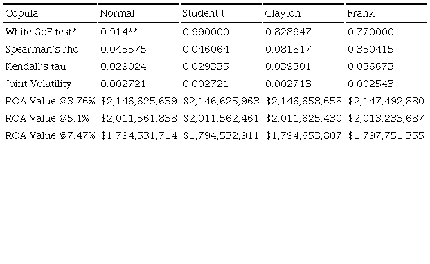 It is observable that in all cases the probability indicates that we are in the no-rejection area, thus accepting the null hypothesis that the copula fits the data. According to the Vuong and Clarke GoF tests, the Normal copula outperforms all others fitting the provided data. It is interesting to discern that, even though Normal and Student’s t copulas do not capture tail dependence, their results are very similar to that of the Clayton copula (when variables exhibit dependence in the lower tail). Both cases yield a positive net present value when considering the ROA valuation, indicating that the project should be accepted. The case of the Frank copula is also peculiar because the strongest dependence is located in the middle of the distribution and, therefore, is known to be better suited for margins that exhibit weak tail dependence, which seems to be the case with the selected underlying assets. When using the results of this copula, the valuation is slightly bigger than with the former three.