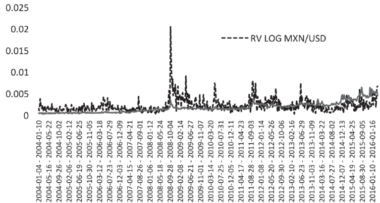 Predicting the volatility of the exchange rate in the short term is undoubtedly a challenge for heavily traded emerging markets, which are subject to natural speculation against less volatile currencies in the short term. The Mexican peso (MXN) is the tenth most traded currency in the world. The daily turnover of the peso oscillates around USD 112 000 million and 97% of these transactions are made against the US dollar. The latter currency had a total trading volume of all currencies of 87.6% in 2016.1
