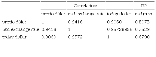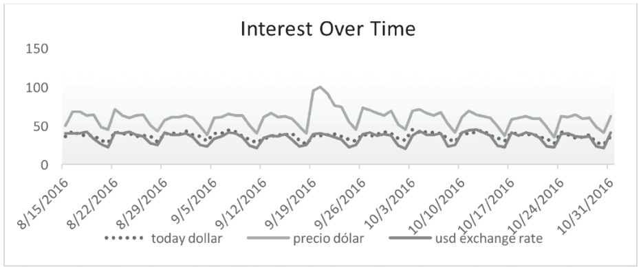 Taking into account that the keyword must maintain a similar trend with the exchange rate (i.e., one can introduce the keywords in the portal and see a similar trend), Google Correlate was consistent in terms of keywords related to the exchange rate. The geographical area can be interested in acquiring USD or it can start speculation in demand for USD. The 30 search terms are reduced to only three: “precio dolar,” “USD exchange rate,” and “today dollar.”
