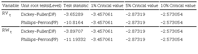 RVt and RWt=exp(-ω1(RVt-Gt)) RVt are weakly stationary in booth models. Table 2 reports our results of unit root tests (Dickey & Fuller, 1979, 1981) and (Phillips & Perron, 1988).