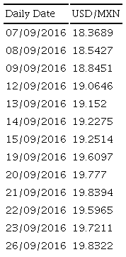 In Figure 3, the behavior shown by investors before the historical maximum of the MXN- USD exchange rate shows no considerable variation. If we undertake a visualization using a window of more years, it is clear that there is no change in tendency in the series over the period. In Table 4, we can confront this with the real values of the exchange rate. Over time, interest only increases highly from September 19, 2016 to September 20, 2016 (see Figure 3) and from September 21, 2016 to September 26, 2016 the interest rate is down. In this last period, higher values of the MXN-USD exchange rate are achieved.
