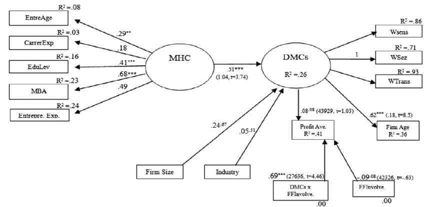 Hypothesis 1 examined the relationship between the level of an ECEO’s DMCs and firm performance. The model in Figure 1 shows that ECEO’s DMCs are positively and significantly influential only when longevity is used to measure performance not for financial terms (annual profit average). The probability for this test is less than 0.001 (p < 0.001), thus partially supporting hypothesis 1. A standardized regression weight of 0.62 indicates that ECEO‘s DMCs influence the level of firm performance. Statistically, this means that a firm’s performance improves by approximately 0.62 standard deviation units when the CEO‘s DMCs increases by one standard deviation.