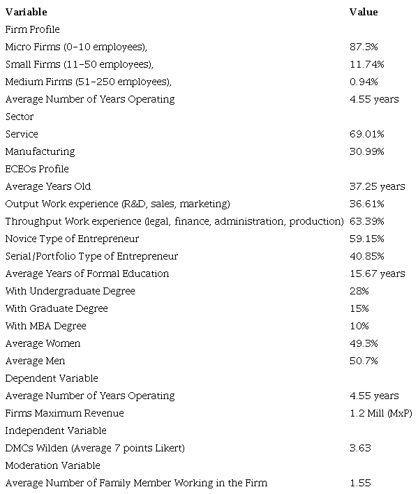 Table 5.1 provides descriptive information about the whole sample. In regards to firm size, our results are similar to those reported by INEGI (2019) in Mexico: 95.9% are micro, 3.3% small, 0.7% medium, and 0.2% large. About the ECEOs’ profile, they are an average of 37.25 years old, 50.7% are male, and 49.3% are female. Although the great equality in gender participation could be unexpected, these results are supported by some official government reports, i.e., INJUVE (2014). The ECEOs in our sample have an average of 15.67 years of formal education.