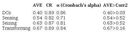 Respondents were asked to assess how much they contributed into the processes that emerge from the three original dimensions of DCs on a seven-point interval Likert scale, where 1 = rarely or extremely infrequent and 7 = extremely frequent. Table 2 presents the constructs for measuring DCs exhibited convergent and discriminant validity. All Cronbach’s alpha values were above the suggested value of 0.70 (Subramaniam and Youndt, 2005), and all loadings and weights were significant at the 0.001 level (2-tailed). Therefore, the instrument for measuring DMCs is valid and internally consistent. Discriminant validity was inspected using the Fornell and Larcker (1982) criterion, which basically states that in order for discriminant validity to exist, the AVE should be larger than the square root of its largest correlation with any construct, which all the constructs of DCs fulfilled.