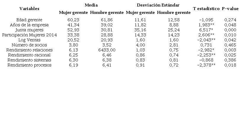 En esta sección se presentan los resultados del modelo y los estadísticos descriptivos. Para empezar, en la Tabla 1 se muestran los estadísticos descriptivos de las empresas según el género del gerente. El T-test de diferencia de medias muestra que, con respecto a los hombres, las mujeres dirigen empresas con más años de antigüedad, cuando son gerentes hay una mayor proporción de mujeres en la junta, tienen un mayor número de trabajadoras mujeres, las ventas son menores y con rendimiento en relaciones, racional y procesos más bajo.