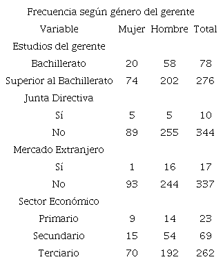 Por otra parte, en la Tabla 2 se presentan las características del gerente y la empresa según el género del directivo. En esta pueden apreciarse atributos tales como: nivel educativo, la presencia de junta directiva, la participación en el mercado extranjero y el sector al cual pertenece. De acuerdo con los resultados, existe una mayor proporción de mujeres con estudios superiores al bachillerato, sin embargo esta proporción es mucho menor a la de los hombres. Con respecto a la junta directiva, la mayor parte de las empresas gerenciadas por mujeres no tienen junta directiva y no participan en el mercado extranjero. En relación al sector económico, la mayor parte de las mujeres se encuentran en el sector terciario al igual que los hombres.