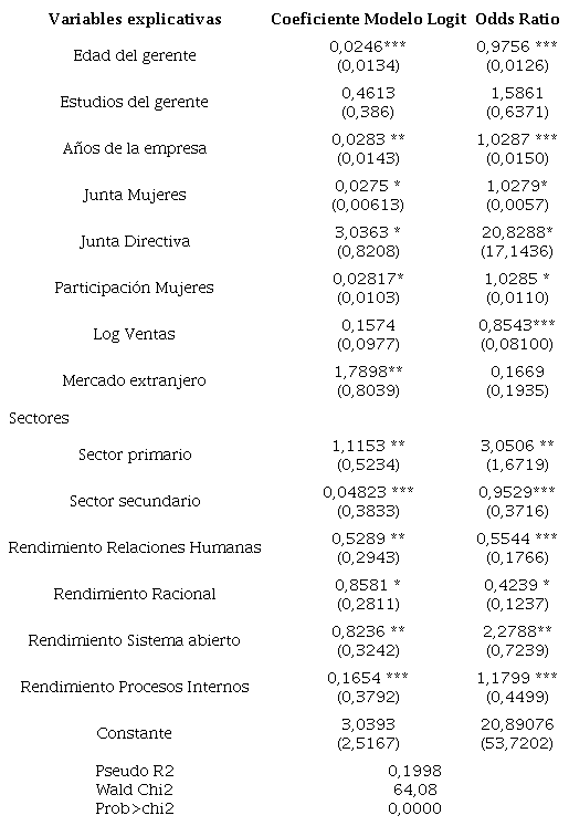 Con respecto a la Hipótesis 7, la cual propone que las empresas que se encuentran en el sector terciario son gestionadas por mujeres, podemos decir que no existe evidencia suficiente para aceptar o rechazar dicha hipótesis, ya que al realizar la estimación esta variable es omitida por el modelo. En la Hipótesis 8 se plantea que el crecimiento de las ventas en empresas gestionadas por mujeres es menor; esta variable no es estadísticamente significativa, por lo que no es posible determinar si el crecimiento de las ventas tiene influencia en la probabilidad de que una mujer sea gerente. Por otro lado, considerando la Hipótesis 9 se puede afirmar que la participación en el mercado extranjero sí tiene influencia en la probabilidad de que una mujer sea gerente y esta relación es negativa. Adicionalmente, teniendo en cuenta los Odds Ratio se puede determinar si esta probabilidad es menor con respecto a la de los hombres; al analizar los resultados podemos concluir que es correcto afirmar que la probabilidad de participar en el mercado extranjero con respecto a la de los hombres es menor para las mujeres. Para finalizar, la Hipótesis 10 propone una relación inversa entre la probabilidad de que una mujer sea gerente y el rendimiento. Los resultados muestran que esta relación es correcta para el Rendimiento en Relaciones Humanas y el Rendimiento Racional, sin embargo, se rechaza esta hipótesis para el Rendimiento de Sistema Abierto y de Procesos Internos.