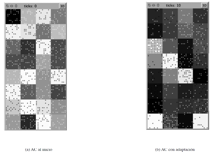 La Figura 2 (a) muestra a los estados en el momento 0 (condiciones iniciales del modelo). En la Figura 2 (b), se muestra el modelo una vez que se ha generado un proceso de adaptación en el tiempo y reflejando la distribución poblacional de México. Este segundo caso se genera por las decisiones de residencia de los agentes.