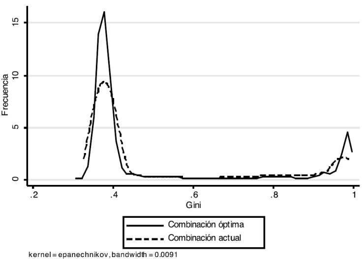 En ambos casos, también se observa un área relativamente amplia, con baja o nula probabilidad de ocurrencia en el intervalo de valores (0.45, 0.90) del Gini. Esto también resulta interesante, porque implica que en el tiempo, el comportamiento del esquema de asignación actual solo puede tener dos resultados: el de una desigualdad cercana a 0.45 parecido al actual o el de una desigualdad muy alta mayor a 0.9 o cercana a 1.00.
