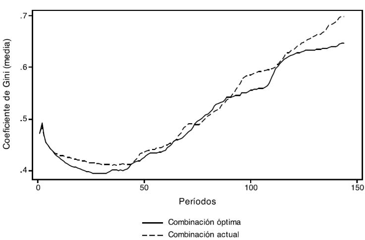 Para los primeros periodos (poco más de tres años) se observa una reducción en desigualdad en ambas combinaciones (actual y óptima) lo que implica que en sus primeros momentos el ajuste de parámetros conlleva a una menor desigualdad.