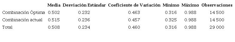 En la Tabla 2 presentamos una comparación de las variables de desempeño en cada escenario. En el escenario con combinación óptima (i.e. con los parámetros de la ecuación 2), se tiene un Gini en promedio de 0.50, mientras que con la combinación actual de ponderadores, el Gini es de 0.52.