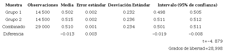 Esto implica que un cambio en la FF, puede reducir marginalmente la desigualdad del ingreso en dos puntos porcentuales.13 Una prueba de medias demuestra precisamente la existencia de esta diferencia (ver estadístico t en la Tabla 3). La desviación estándar en los dos casos es alta (poco más de 0.200, considerando medias de alrededor de 0.500) y se podría argumentar que los coeficientes promedio del Gini en los dos escenarios, no deberían ser estadísticamente distintos.